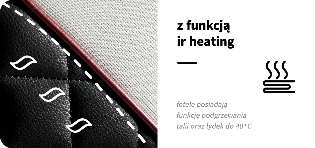 Fotel wyposażony jest w opcję podgrzewania pleców. Funkcja ta skutecznie wspiera i uprzyjemnia rozmasowanie napięć, zwiększając komfort płynący z masażu. Model ten posiada mechaniczną regulację wysunięcia podnóżka, dzięki czemu każdy użytkownik – niezależnie od wzrostu – będzie mógł znaleźć dla siebie wygodną pozycję do masażu.