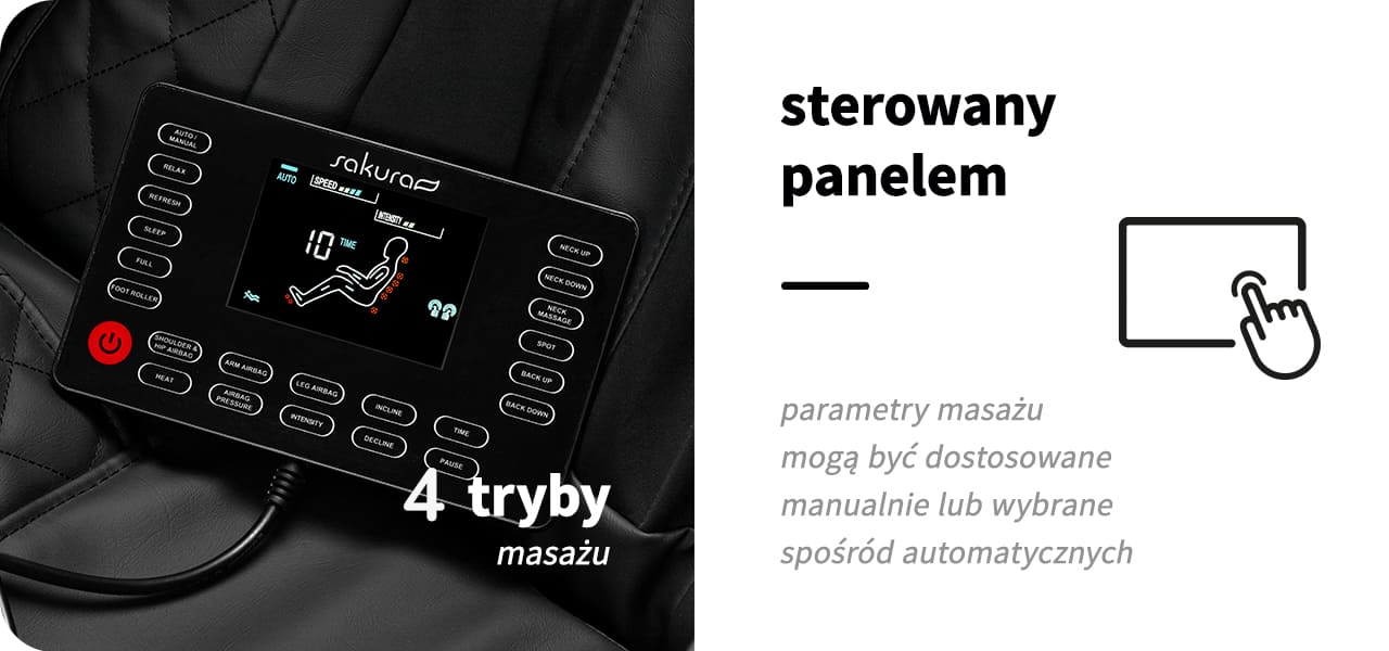 Czytelny panel sterowania sprawia, że korzystanie z fotela jest proste i przyjemne. Większą wygodę zapewnia możliwość umieszczenia go na uchwycie zamontowanym na prawym podłokietniku bądź trzymania w dłoniach. Na przejrzystym ekranie LCD można śledzić pracę urządzenia, wyraźnie wyświetlane są tam obszary ciała, na których w danym momencie przeprowadzany jest masaż, jego intensywność, czas zabiegu oraz wybrany program. Panel pozwala na wybór programu masażu, swobodne dostosowanie ustawień fotela oraz funkcji masażu, regulację intensywności, a także ustalenie czasu trwania zabiegu, który może wynosić 15, 20, 25 lub 30 minut.