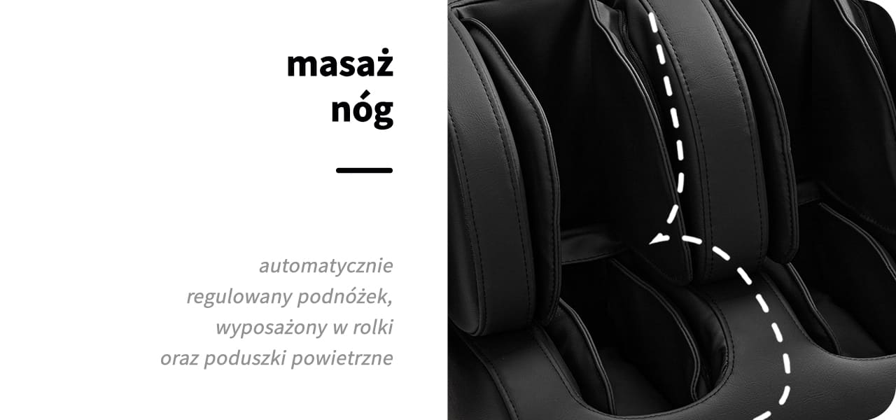 Mechanizm masujący dokładnie i przyjemnie rozmasowuje mięśnie na kilka sposobów. Sześć głowic masujących poruszających się w górę i w dół zapewnia efektywny masaż pleców, imitując pracę ludzkich rąk. Ich ruchy wykonują masaż stukający, ugniatający oraz uciskający, dzięki czemu poprawiają ogólną sprawność organizmu i eliminują bóle. Po każdej sesji masażu na fotelu zauważalna jest wyraźna redukcja napięcia mięśni, a ciało staje się przyjemnie zrelaksowane oraz pobudzone. Wbudowany masażer rolkowy stóp stosuje metody akupresury, a jego praca skutecznie rozluźnia mięśnie, niweluje zmęczenie oraz wpływa pozytywnie na ogólne samopoczucie.