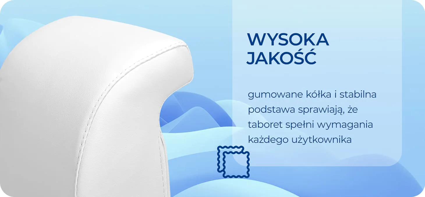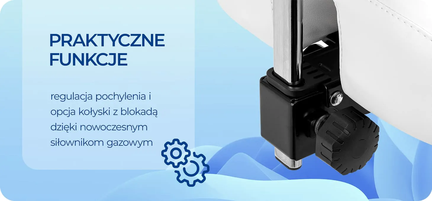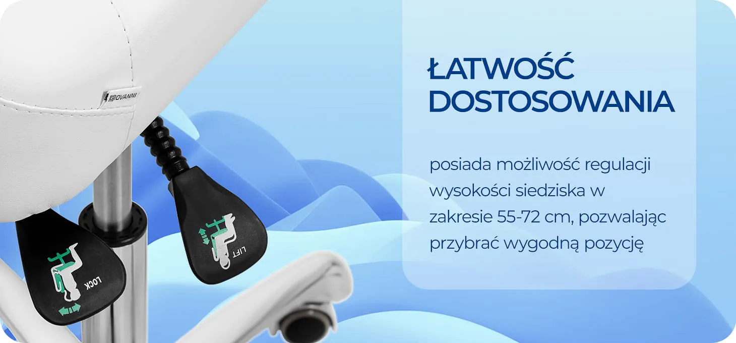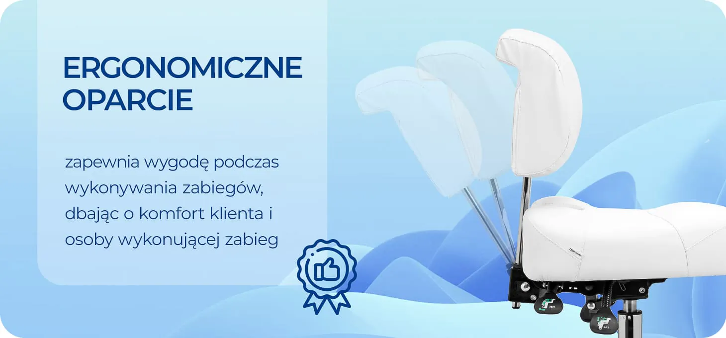 Możliwość regulacji wysokości w zakresie 55-72 cm pozwala przybrać odpowiednią pozycję w trakcie wykonywania usług. Perfekcyjnie wyprofilowane oparcie z regulacją zapewnia optymalne wsparcie dla odcinka lędźwiowego, minimalizując zmęczenie podczas długotrwałej pracy. Mechanizm pełnego obrotu, że praca staje się bardziej efektywna i wygodna. Taboret posiada również funkcję kołyski z możliwością blokady, co pozwala na ergonomiczne ustawienie ciała. Siedzisko zapewnia regulację pochylenia oraz wysokości dzięki siłownikom gazowym. Dodatkowo wysokość oparcia można manualnie dostosować dla pełnej wygody użytkowania.
