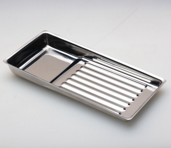 Metalowa taca o specjalnym kształcie do przechowania i sterylizacji narzędzi do manicure oraz instrumentów medycznych.