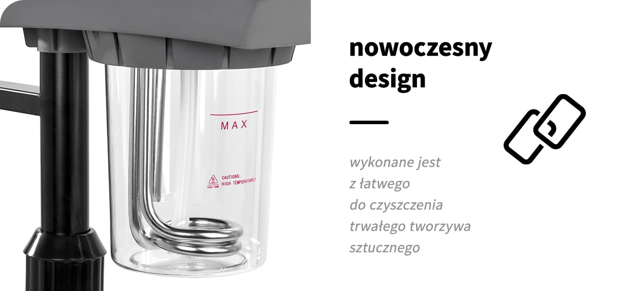 Wapozon wykonano z tworzywa sztucznego w odcieniach czerni, co sprawia, że urządzenie łatwo utrzymać w czystości. Statyw wyposażony jest w prostą regulację wysokości w zakresie 78-95 cm, co pozwala na ustawienie sprzętu na odpowiednim poziomie, by zapewnić komfort pracy osobie wykonującej zabieg. Dyszę wapozonu można obracać, co zwiększa zakres możliwego ustawienia. Czteroramienna podstawa o gumowanych kółkach poprawia mobilność, ułatwiając swobodne przestawianie urządzenia.